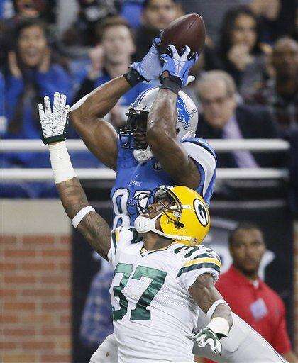 Detroit Lions wide receiver Calvin Johnson (81) stretches but is unable to catch the pass while defended by Green Bay Packers cornerback Sam Shields (37) during the second half of an NFL football game, Thursday, Dec. 3, 2015, in Detroit. (AP Photo/Rick Osentoski) The Associated Press
