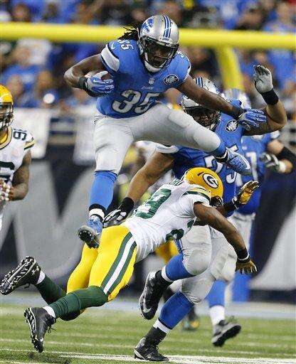 Detroit Lions running back Joique Bell (35) leaps over Green Bay Packers cornerback Casey Hayward (29) during the second half of an NFL football game, Thursday, Dec. 3, 2015, in Detroit. (AP Photo/Rick Osentoski) The Associated Press