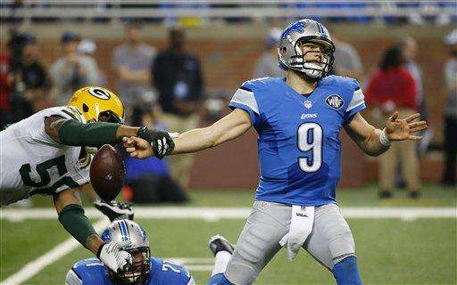 Detroit Lions quarterback Matthew Stafford (9) is stripped of the ball by Green Bay Packers outside linebacker Julius Peppers (56) during the second half of an NFL football game, Thursday, Dec. 3, 2015, in Detroit. The ball was recovered by Green Bay. (AP Photo/Paul Sancya) The Associated Press