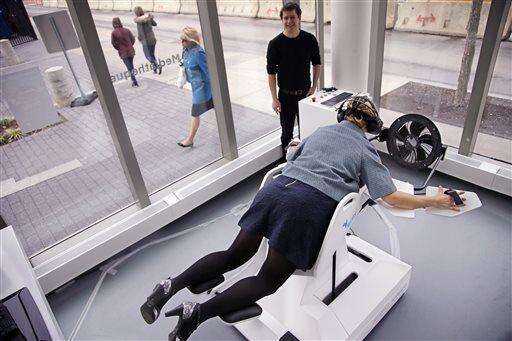 In the Thursday, Dec. 3, 2015, photo a line of people que to fly Birdly, a virtual reality flying machine, as a man takes a flight at Le Laboratoire Cambridge in Cambridge, Mass. The simulator looks like a futuristic examining table where users lie on their bellies and spread their arms like wings. Using virtual reality goggles, they get a bird’s eye view of New York City. By rotating their hands and flapping their arms, they navigate the skyline. (AP Photo/Stephan Savoia) The Associated Press