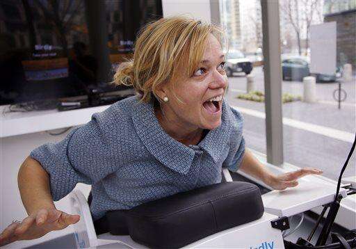 In the Thursday, Dec. 3, 2015, photo Carrie Fitzsimmons reacts to the sensation of having taken her first flight aboard Birdly, a virtual reality flying machine, at Le Laboratoire Cambridge in Cambridge, Mass. The simulator looks like a futuristic examining table where users lie on their bellies and spread their arms like wings. Using virtual reality goggles, they get a bird’s eye view of New York City. By rotating their hands and flapping their arms, they navigate the skyline. (AP Photo/Stephan Savoia) The Associated Press