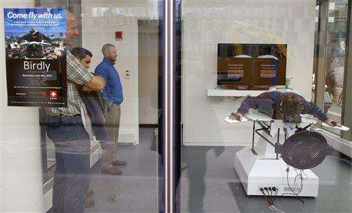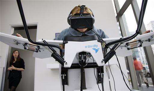 CORRECTS SPELLING TO LE LABORATOIRE FROM LE LABORATORIE - In the Thursday, Dec. 3, 2015, photo Carrie Fitzsimmons takes her first flight on Birdly, a virtual reality flying machine, under the direction of Jonathan Talit, background, at Le Laboratoire Cambridge in Cambridge, Mass. The simulator that lets people sample flight as a bird has been drawing crowds. (AP Photo/Stephan Savoia) The Associated Press
