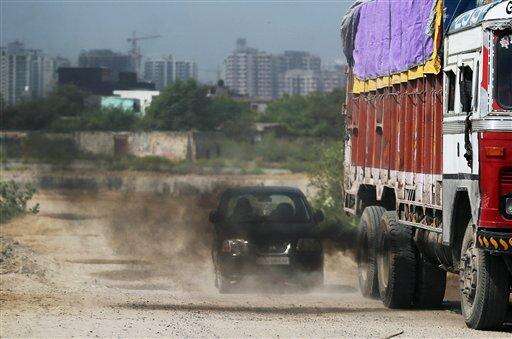 FILE - In this Sept. 23, 2015 file photo, a truck gives out smoke as it drives past a car in New Delhi, India. The city is imposing new rules to reduce its notoriously snarled traffic and fight extreme air pollution that has earned Indiaâs capital the title of world's most polluted city. From Jan. 1, for several weeks, private cars will only be allowed on roads on alternate days, depending on whether their license plates end in even or odd numbers. (AP Photo/Altaf Qadri, File)