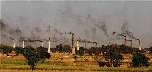FILE- In this Tuesday, Sept. 23, 2014 file photo, smoke rises from chimneys of brick kilns on the outskirts of New Delhi, India. New Delhi is imposing new rules to reduce its notoriously snarled traffic and fight extreme air pollution that has earned Indiaâs capital the title of world's most polluted city. (AP Photo/Altaf Qadri, File)