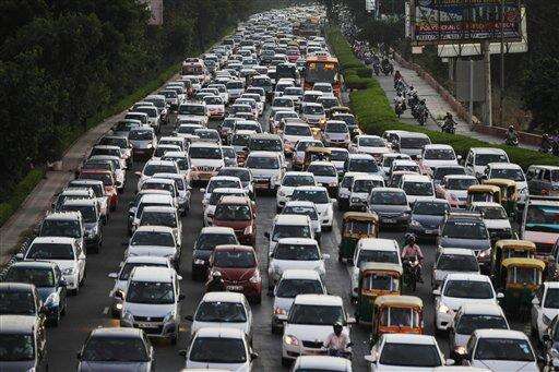 FILE - In this Tuesday, Sept. 23, 2014 file photo, traffic moves at dusk in New Delhi, India. The city is imposing new rules to reduce its notoriously snarled traffic and fight extreme air pollution that has earned Indiaâs capital the title of world's most polluted city. From Jan. 1, for several weeks, private cars will only be allowed on roads on alternate days, depending on whether their license plates end in even or odd numbers. (AP Photo/Altaf Qadri, File)