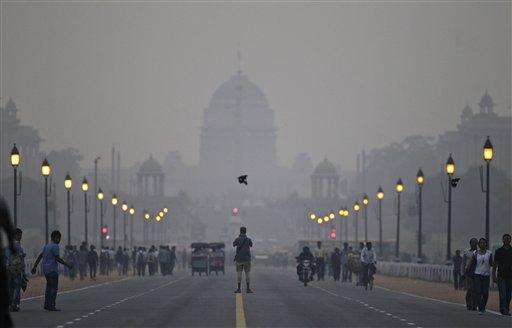 FILE - In this Nov. 3, 2012 file photo, a tourist stands in the middle of a street in front of the Presidential Palace enveloped in a blanket of smog, caused by a mixture of pollution and fog, in New Delhi, India. New Delhi city is imposing new rules to reduce its notoriously snarled traffic and fight extreme air pollution that has earned Indiaâs capital the title of world's most polluted city. (AP Photo/Altaf Qadri, File)
