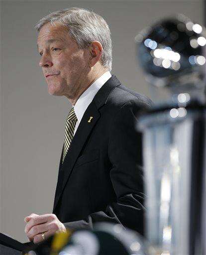 Iowa head coach Kirk Ferentz responds to a question during a news conference for the Big Ten Conference championship NCAA college football game Friday, Dec. 4, 2015, in Indianapolis. Iowa will play Michigan State Saturday for the championship. (AP Photo/Darron Cummings) The Associated Press