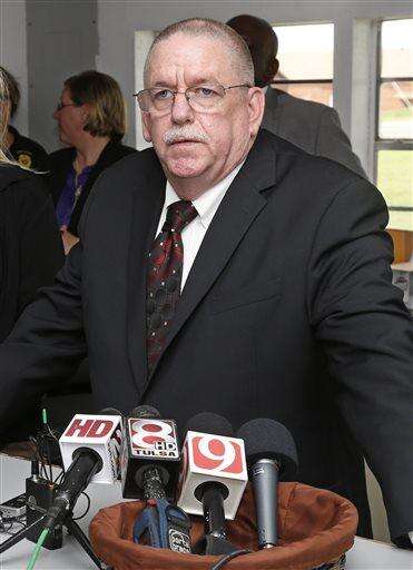 FILE - In this Wednesday, Sept. 16, 2015 file photo, Robert Patton, director of the Oklahoma Department of Prisons, announces that the execution of Richard Glossip, scheduled for Wednesday, Sept. 16, 2015, has been stayed, at the Oklahoma State Penitentiary in McAlester Okla. Patton has announced that he will resign from his role as director, effective Jan. 31, 2016. He will be on accrued leave beginning Dec. 25. (AP Photo/Sue Ogrocki, File) The Associated Press