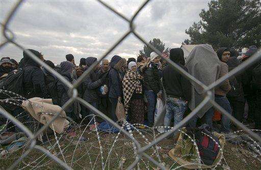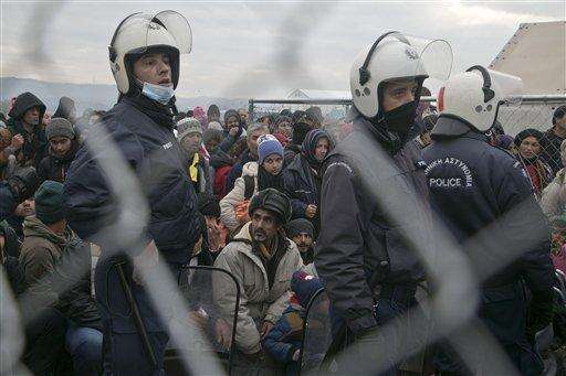 Stranded migrants, await entry into Macedonia on the Greek side of the border photographed through a fence from Macedonian side of the border, near the southern Macedonian town of Gevgelija, Friday, Dec. 4, 2015. Greek riot police struggled to maintain order on Friday after clashes between asylum-seekers at the country's border with Macedonia. Macedonia is allowing only people from Afghanistan, Iraq and Syria to cross the border, and groups of people from other nationalities have set up makeshift roadblocks, preventing anyone from crossing. (AP Photo/Visar Kryeziu)