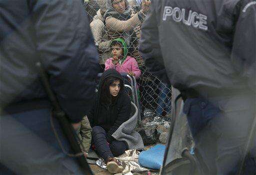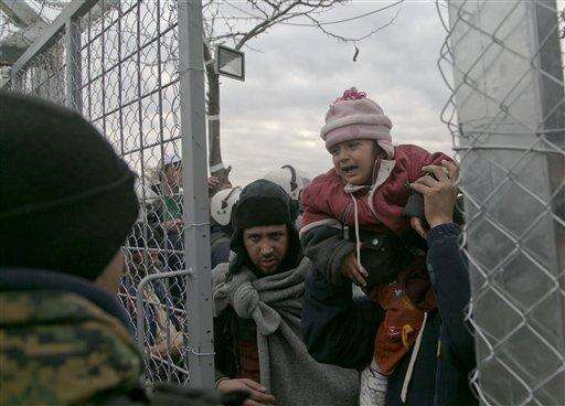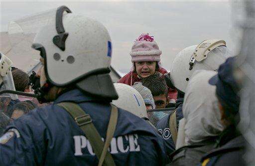 A migrant child cries as they wait to cross into Macedonia, near the southern Macedonian town of Gevgelija, Friday, Dec. 4, 2015. Greek riot police struggled to maintain order on Friday after clashes between asylum-seekers at the country's border with Macedonia. Macedonia is allowing only people from Afghanistan, Iraq and Syria to cross the border, and groups of people from other nationalities have set up makeshift roadblocks, preventing anyone from crossing. (AP Photo/Visar Kryeziu)