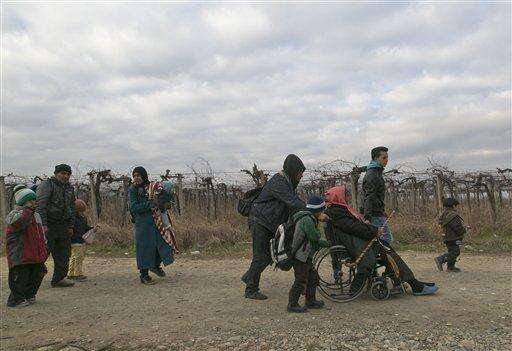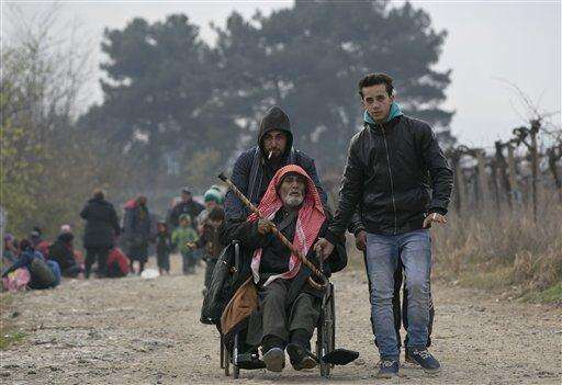 CORRECTS MONTH IN DATE Migrants assist an old man in a wheelchair after entering Macedonia from Greece, near the southern Macedonian town of Gevgelija, Friday, Dec. 4, 2015. Greek riot police struggled to maintain order on Friday after clashes between asylum-seekers at the country's border with Macedonia. Macedonia is allowing only people from Afghanistan, Iraq and Syria to cross the border, and groups of people from other nationalities have set up makeshift roadblocks, preventing anyone from crossing. (AP Photo/Visar Kryeziu)