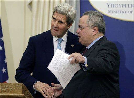 U.S. Secretary of State John Kerry, left, listens to his Greek counterpart Nikos Kotzias during a news conference in Athens, Friday, Dec. 4, 2015. Kerry will hold bilateral meetings to discuss the migration and refugee crisis. (AP Photo/Thanassis Stavrakis)