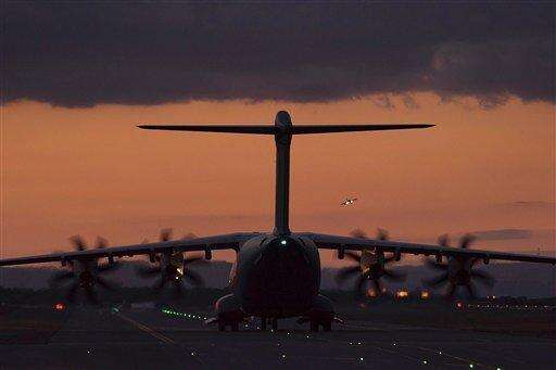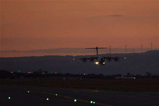A transport aircraft landing at RAF Akrotiri, a British air base near the coastal city of Limassol, Cyprus, Thursday, Dec. 3, 2015. British warplanes carried out airstrikes in Syria early Thursday, hours after Parliament voted to authorize air attacks against Islamic State group targets there. Eight more British jets arrived at RAF Akrotiri to join the attacks. (AP Photo/Pavlos Vrionides) The Associated Press