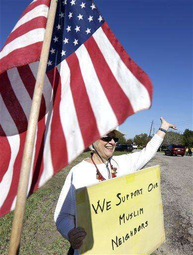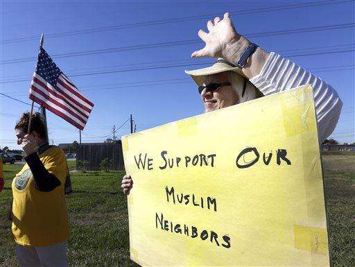 Paula Criswell, center, holds a sign as she joins others in a rally to show support for Muslim members of the community near the Clear Lake Islamic Center in Webster, Texas on Friday, Dec. 4, 2015. Members of several Unitarian Universalist churches and the Unitarian Voices for Justice group showed their support as attendees made their way to the center for Friday prayers. Organizers said the rally was scheduled prior to Wednesday's mass shooting in San Bernardino, Calif. (AP Photo/David J. Phillip)