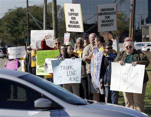 People hold signs during a rally to show support for Muslim members of the community near the Clear Lake Islamic Center in Webster, Texas on Friday, Dec. 4, 2015. Members of several Unitarian Universalist churches and the Unitarian Voices for Justice group showed their support as attendees made their way to the center for Friday prayers. Organizers said the rally was scheduled prior to Wednesday's mass shooting in San Bernardino, Calif. (AP Photo/David J. Phillip)