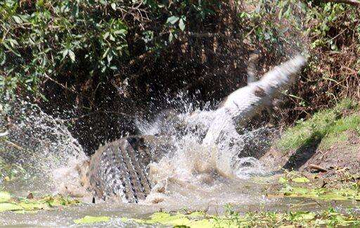 CANBERRA, Australia (AP) - Tourist Sandra Bell was poised to photograph a sedate scene of two crocodiles sunning themselves at the edge of an Australian waterhole when the picture unexpectedly exploded into violence.