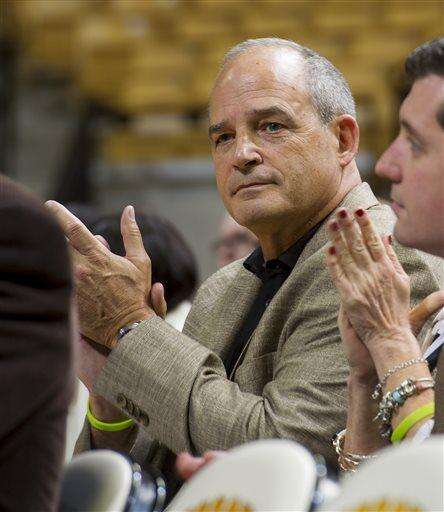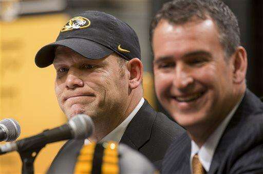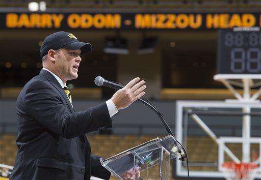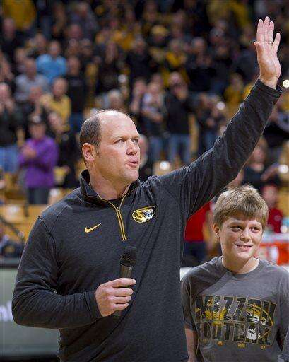 Missouri head football coach Barry Odom addressed Mizzou Arena from half court during halftime. Athletic director Mack Rhoades announced yesterday that Odom, after his first year as defensive coordinator, would replace Gary Pinkel in 2016. Pinkel announced his retirement last month, having been diagnosed with non-Hodgkin lymphoma in May.