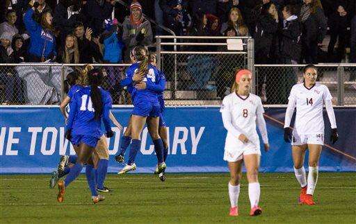 Duke celebrates behind Florida State’s Michaela Hahn (8) and Florida State’s Natalia Kuikka (14) after Duke’s Kayla McCoy (12) scored a goal in the first half of an NCAA Women's College Cup soccer semifinal in Cary, N.C., Friday, Dec. 4, 2015. (AP Photo/Ben McKeown) The Associated Press