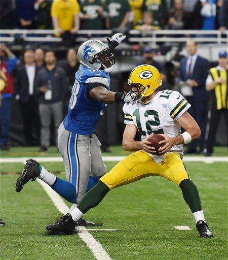 Detroit Lions defensive end Devin Taylor (98) reaches in on Green Bay Packers quarterback Aaron Rodgers (12) and is called for a face mask during the second half of an NFL football game, Thursday, Dec. 3, 2015, in Detroit. (AP Photo/Melanie Maxwell/The Ann Arbor News/Mlive.com via AP) The Associated Press