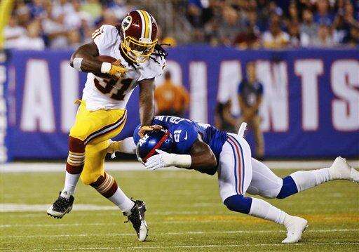 ADVANCE FOR SUNDAY, DEC. 6 AND THEREAFTER - FILE - In this Sept 24, 2015 file photo, Washington Redskins running back Matt Jones (31) stiff arms New York Giants' Landon Collins (21) during the first half an NFL football game in East Rutherford, N.J. With increasing frequency, NFL teams are throwing screen passes, to running backs, yes, but also to tight ends or wide receivers , in an effort to get easy gains and, occasionally, break long ones. There are about 1 1/2 more completed screens per game this season than just five years ago, according to STATS. (AP Photo/Kathy Willens, File) The Associated Press
