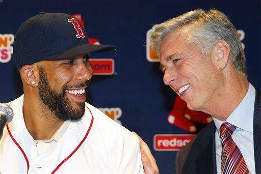 Boston Red Sox pitcher David Price, left, smiles at president of baseball operations Dave Dombrowski during a news conference announcing his signing by the teamat Fenway Park in Boston, Friday, Dec. 4, 2015. (AP Photo/Winslow Townson) The Associated Press
