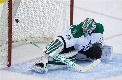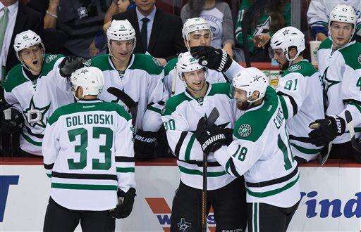 Trailing 2-1 through 40 minutes, Vancouver tied the game at 5:31 of the third when Sedin jumped on Goligoski's giveaway and fed a wide-open Hansen, who coolly beat Lehtonen for his eighth goal of the season.