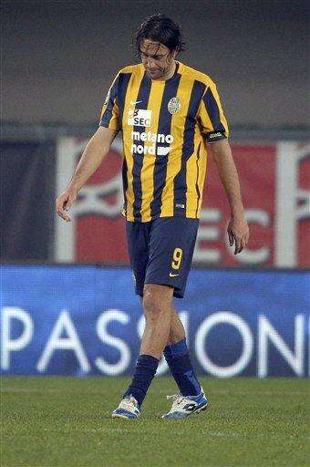 Hellas Verona's Luca Toni walks off the pitch at the end of the Serie A soccer match between Hellas Verona and Empoli at the Bentegodi stadium in Verona, Italy, Sunday, Dec. 6, 2015. World Cup winner Luca Toni has hinted he could retire at the end of the season. Toni, who currently plays for relegation-threatened Hellas Verona, turns 39 next May. (Filippo Venezia/ANSA via AP)