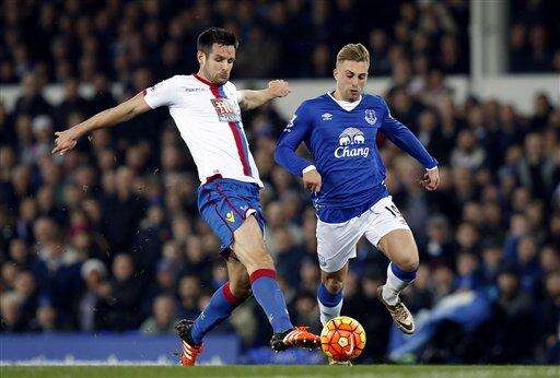 Crystal Palace's Scott Dann, left, and Everton's Gerard Deulofeu during the English Premier League match at Goodison Park, Liverpool, England, Monday Dec. 7, 2015. (Peter Byrne / PA via AP) UNITED KINGDOM OUT - NO SALES - NO ARCHIVES