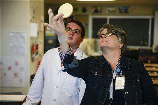 In this photo taken on Dec. 2, 2015, BHSS teacher Barbara Hawkins talks about a cancer experiment with Ryan Cutshall in her high school medical interventions class in Bloomington, Ind. The students tested mutant yeast to find out if it could repair itself when exposed to the sun's ultraviolet rays. (Jeremy Hogan/Bloomington Herald-Times via AP) MANDATORY CREDIT The Associated Press