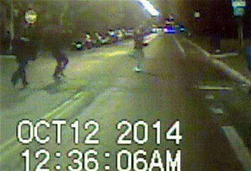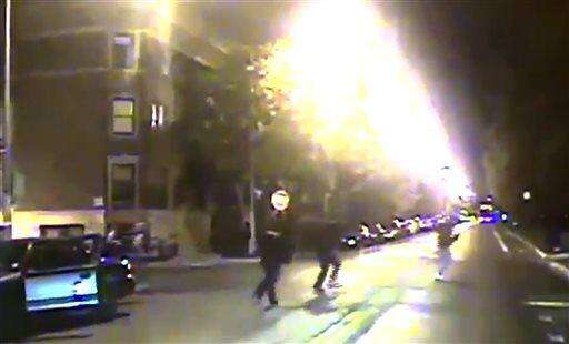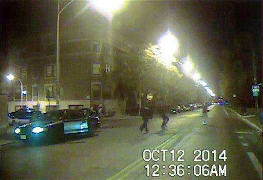 In this frame grab made from an Oct. 12, 2014 video released by Chicago Police Department, Ronald Johnson, right, is seen running from police officers just a second before he was shot by an officer. Prosecutors say a Chicago police officer will not be charged in the shooting of the 25-year-old black man who authorities said was armed with a gun as he ran away from officers. (Chicago Police Department via AP)