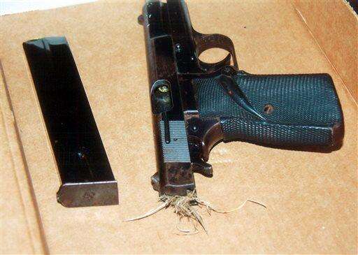 This Oct. 12, 2014 photo provided by the Cook County State's Attorney show a handgun with a clump of grass stuck in the slide that police say was recovered from Ronald Johnson at the scene of a shooting in Chicago. Authorities announced Monday, Dec. 7, 2015 that a Chicago police officer will not be charged in the shooting death of Johnson, a 25-year-old black man, who authorities said was armed with a gun as he ran away from officers. (Cook County State's Attorney via AP)