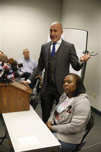Dorothy Holmes, mother of Ronald Johnson, listens to family attorney Michael Oppenheimer at a news conference, Monday, Dec. 7, 2015, in Chicago. Cook County State's Attorney Anita Alvarez said Monday that there would be no charges against Officer George Hernandez in the shooting of Johnson, whom authorities say pointed a gun at police before he was killed on Oct. 12, 2014. (AP Photo/Charles Rex Arbogast)