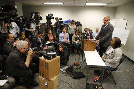 Attorney Michael Oppenheimer, left, next to Dorothy Holmes, right, mother of Ronald Johnson, speaks at a news conference, Monday, Dec. 7, 2015, in Chicago. Cook County State's Attorney Anita Alvarez said Monday that there would be no charges against Officer George Hernandez in the shooting of Johnson, whom authorities say pointed a gun at police before he was killed on Oct. 12, 2014. (AP Photo/Charles Rex Arbogast)
