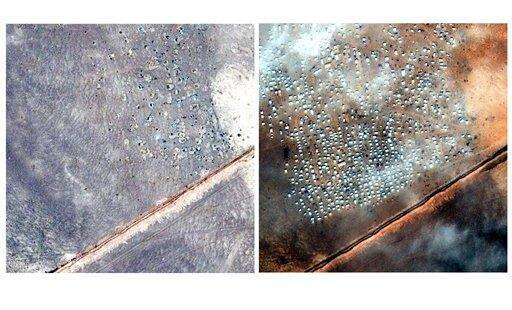 This combination of two satellite images taken on April 20, 2015 and Dec. 5, 2015, right, shows the Rukban tent encampment for Syrian refugees at the border with Jordan. Jordan has disputed a U.N. report that 12,000 Syrian refugees have amassed in a remote desert area on the kingdom's border, waiting to be let in. The U.N. refugee agency says the number of refugees stranded on the border tripled to 12,000 since November because of intensifying fighting in Syria. It has appealed to Jordan to allow them to enter, saying lives are at risk. (CNES 2015 / Distribution Airbus DS via AP)