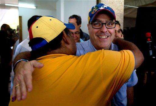 Opposition lawmaker Julio Borges, who was reelected to Congress, is congratulated by a supporter before a news conference in Caracas, Venezuela, Monday, Dec. 7, 2015. Venezuela's opposition won control of the National Assembly by a landslide in Sunday's election, stunning the ruling party and altering the balance of power 17 years after the late Hugo Chavez was elected president. (AP Photo/Fernando Llano)
