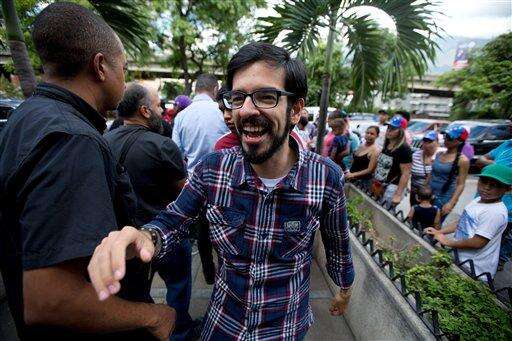 Opposition lawmaker Miguel Pizarro, who was reelected to Congress, greets supporters as he arrives for a news conference in Caracas, Venezuela, Monday, Dec. 7, 2015. Venezuela's opposition won control of the National Assembly by a landslide in Sunday's election, stunning the ruling party and altering the balance of power 17 years after the late Hugo Chavez was elected president. (AP Photo/Fernando Llano)
