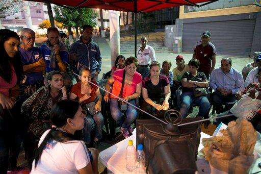 Pro-government supporters watch the latest election information from National Electoral Council, on a television set, outside of a polling station in Caracas, Venezuela, Sunday, Dec. 6, 2015. Some members of the opposition are angry after elections officials ordered polling centers to stay open for an extra hour, even if no one was standing in line to vote, during the day's congressional elections. Government opponents mobbed some voting stations demanding that the National Guard stick to the original schedule of closing at 6 p.m. (AP Photo/Alejandro Cegarra)