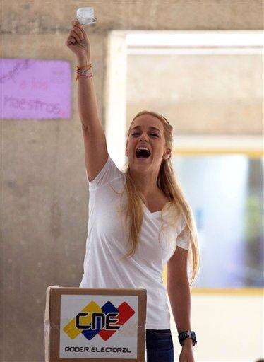 Lilian Tintori, the wife of jailed opposition leader Leopoldo Lopez, yells in Spanish: "For the freedom of political prisoners" as she holds up her electronic voting receipt before placing it in a box during congressional elections in Caracas, Venezuela, Sunday, Dec. 6, 2015. Polls show the opposition coalition holding a 30 point lead ahead of Sunday's congressional election. (AP Photo/Fernando Llano)