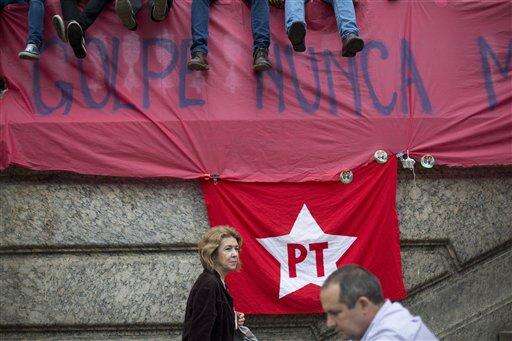 People walk next to a banner that reads "Coup Never Again" during a protest against the impeachment proceedings against Brazil's President Dilma Rousseff, in Rio de Janeiro, Brazil, Tuesday, Dec. 8, 2015. Lawmakers scuffled on the floor of Brazil's lower house Tuesday during an attempt to block a vote on forming a commission that will determine if impeachment proceedings against President Dilma Rousseff should go before the full body. Speaker Eduardo Cunha, Rousseff's bitter rival, allowed impeachment proceedings to be introduced into the House of Deputies last week. (AP Photo/Silvia Izquierdo) The Associated Press