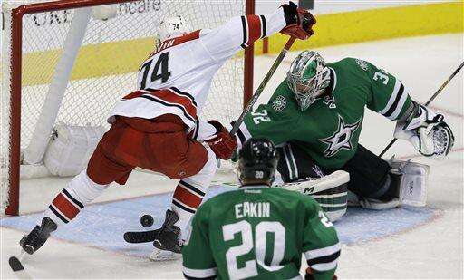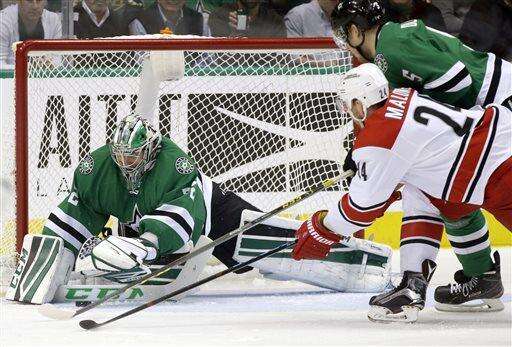 The Stars started slowly and didn't put a shot on goal until 6:49 of the first period, when Eaves scored his first goal of the season on a wrist shot from the left faceoff circle.
