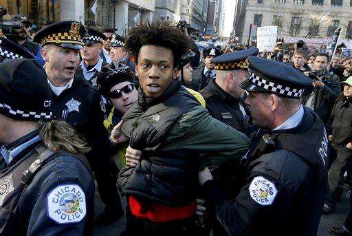 Lamon Reccord is taken into custody by Chicago police officers during a march calling for Chicago mayor Rahm Emanuel and Cook County State's Attorney Anita Alvarez to resign Wednesday, Dec. 9, 2015, in Chicago. Reccord was later released on the scene after protesters blocked the vehicle where he was being held. (AP Photo/Charles Rex Arbogast) The Associated Press