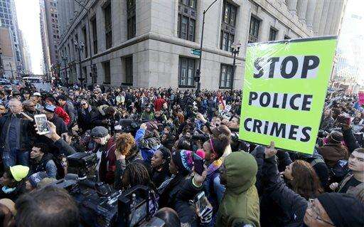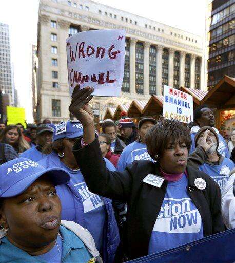 Protesters gather at Chicago's Daley Plaza for a rally and march calling for Mayor Rahm Emanuel and Cook County State's Attorney Anita Alvarez to resign Wednesday, Dec. 9, 2015, in Chicago. (AP Photo/Charles Rex Arbogast) The Associated Press