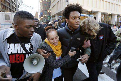 Lamon Reccord, second from right, is reunited with fellow protesters after being released by Chicago police officers during a march calling for Chicago Mayor Rahm Emanuel and Cook County State's Attorney Anita Alvarez to resign Wednesday, Dec. 9, 2015, in Chicago. Reccord was taken into custody, which prompted protesters to blocked the vehicle that was housing Rhim. (AP Photo/Charles Rex Arbogast) The Associated Press
