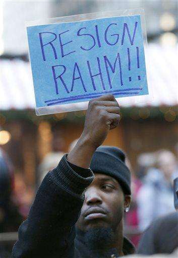A protester holds ups a sign calling for the resignation of Chicago Mayor Rahm Emanuel during a protest march calling for the mayor and Cook County State's Attorney Anita Alvarez to resign Wednesday, Dec. 9, 2015, in Chicago. (AP Photo/Charles Rex Arbogast) The Associated Press