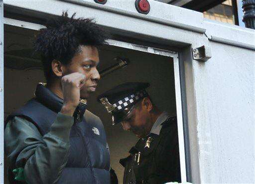 Lamon Reccord acknowledges fellow protesters while being released by Chicago police officers during a march calling for Chicago mayor Rahm Emanuel and Cook County State's Attorney Anita Alvarez to resign Wednesday, Dec. 9, 2015, in Chicago. Reccord was taken into custody, which prompted protesters to block the vehicle that was housing Reccord. (AP Photo/Charles Rex Arbogast) The Associated Press