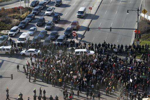 Protesters block the interstate highway traffic coming into downtown Chicago, Wednesday, Dec. 9, 2015, in Chicago after Mayor Rahm Emanuel apologized for the 2014 shooting of a black teenager during a special City Council meeting. Emanuel criticized the police department for being quick to shoot, saying the department's "supervision and leadership" had failed. (AP Photo/Kiichiro Sato) The Associated Press