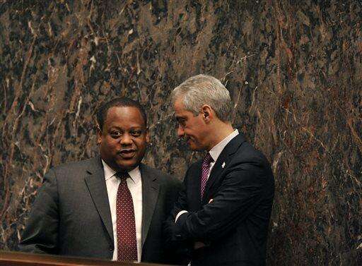 Chicago Alderman Roderick Sawyer left, talks with Chicago Mayor Rahm Emanuel right, before Emanuel spoke during a special City Council meeting that he called to discuss a police abuse scandal Wednesday, Dec. 9, 2015, in Chicago. Emanuel apologized for the 2014 shooting of a black teenager Wednesday during the special City Council meeting and promised "complete and total" reform to restore trust in the police. (AP Photo/Paul Beaty) The Associated Press