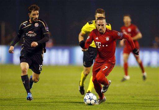 Bayern's Franck Ribery, right and Zagreb's Goncalo Santos run for the ball during the Champions League Group F soccer match between Dinamo Zagreb and Bayern Munich in Zagreb, Croatia, Wednesday, Dec. 9, 2015. (AP Photo/Darko Bandic)