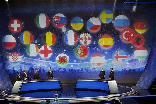 From left : Former French international soccer player Bixente Lizarazu, Former Dutch international soccer player Ruud Gullit, German national soccer team manager Oliver Bierhoff, Former French international soccer player David Trezeguet and Former Greek international soccer player Angelos Charisteas address the audience during the Euro 2016 soccer championships draw in Paris Saturday, Dec. 12, 2015. (AP Photo/Christophe Ena) The Associated Press