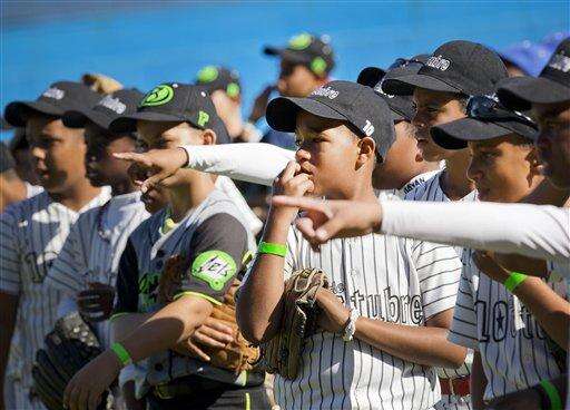 Young baseball players point at MLB players before the start of their baseball clinic in Havana, Cuba, Wednesday, Dec. 16, 2015. Los Angeles Dodgers outfielder Yasiel Puig, St. Louis Cardinals catcher Brayan Pena and Chicago White Sox first baseman Jose Abreu were among those who ran 10- and 11-year-old Cuban players through a skills camp on the second day of a three-day mission meant to warm relations between Major League Baseball and Cuba. (AP Photo/Ramon Espinosa)